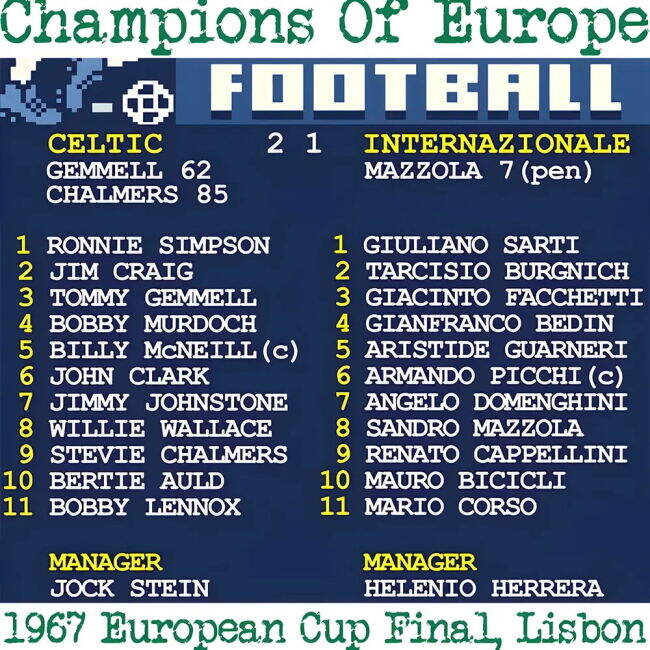 Celtic recovered from conceding an early goal to beat their Italian rivals and become the first Scottish club to win the European Cup, earning the team the nickname the Lisbon Lions. The following year, Manchester United became the first English club to lift the trophy.