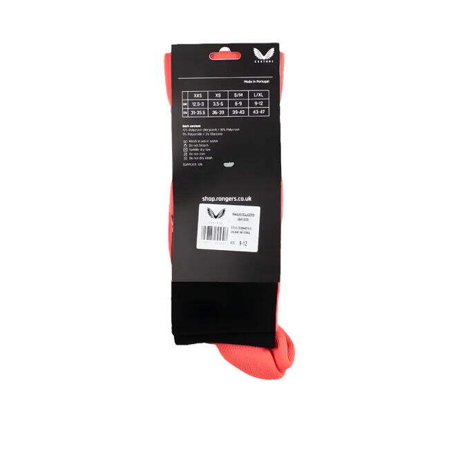 Introducing the Rangers 2023-2024 Football Goalkeeper Away Socks in a vibrant shade of Hot Coral, a striking accessory that perfectly complements the goalkeeper's kit. These socks aren't just sportswear; they're a symbol of focus, determination, and the unwavering spirit of the Rangers Football Club goalkeepers.