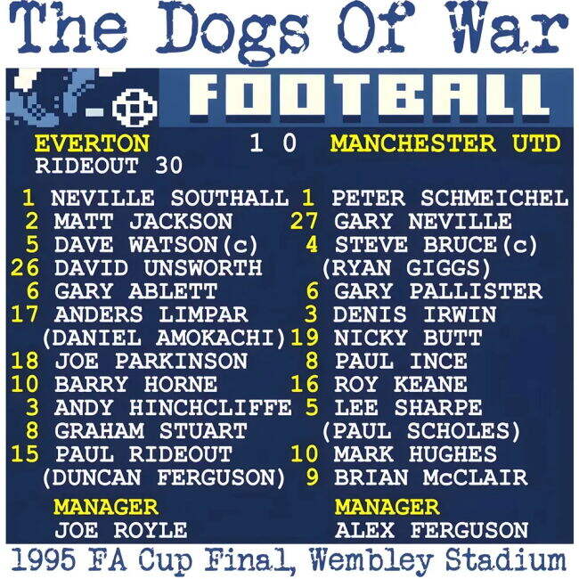 Everton had flirted with relegation in the League but updated manager Joe Royle's 'Dogs of War' came out on top against a Manchester United side deprived of the services of Eric Cantona through suspension for his infamous kung-fu-look attack on a Crystal Palace fan earlier in the season.